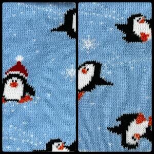 Festive Christmas Penguin Toe Socks in Blue with White Fluffy Fringe Snowflakes