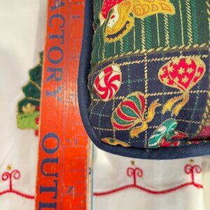 This set includes a decorative Christmas pillow adorned with vibrant holiday-themed patterns and two charming embroidered tea towels. Ideal for seasonal decor.