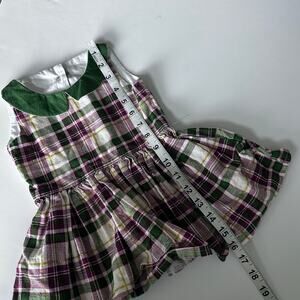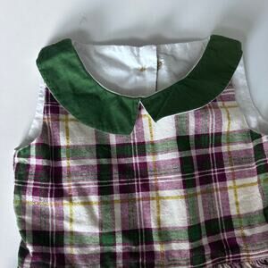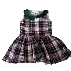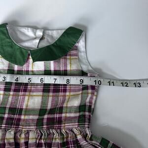 This sleeveless dress features a red plaid pattern, perfect for the festive season. It has a charming green Peter Pan collar that adds a touch of sweetness. The dress is in excellent condition and ready to wear.