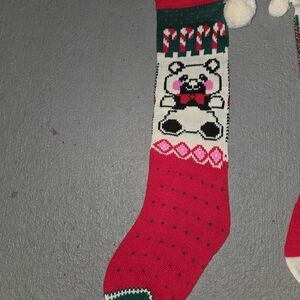 Set of three colorful Christmas stockings. Features holiday designs with red, green, and white colors.