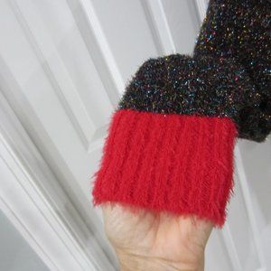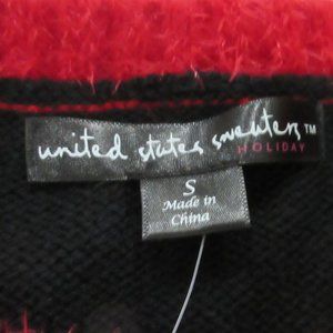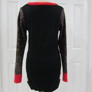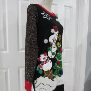 United States Sweaters festive sweater can be worn as a tunic or dress. Stacked snowmen decorating the tree. Black, red, white and green. Ribbed cuffs and bottom hemline. Metallic pom-poms and sleeves bring sparkle to the party!