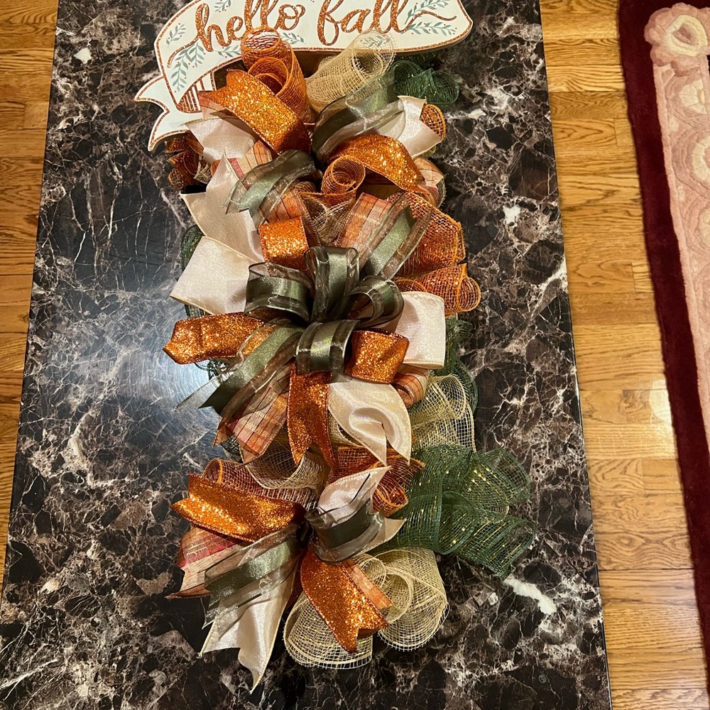 Celebrate the season with this festive fall ribbon decor. Features orange, green, and cream ribbons with a 'Hello Fall' sign. Measurements 24”x15x4”. Homemade and gorgeous!