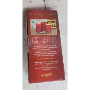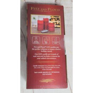 SEO Description: Create a warm and festive holiday atmosphere with the Fitz and Floyd LED Candle Set. Featuring real wax and a flickering light effect, this red candle set comes with a remote control for easy ambiance adjustment. Perfect for holiday decorations and setting a cozy mood in any room.