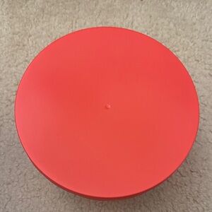 Clear container with gingerbread and heart designs. Red lid adds a festive touch.
