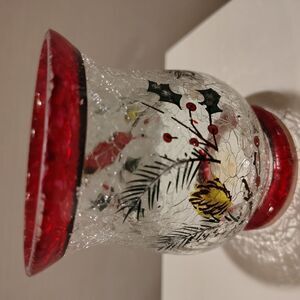 Beautiful glass candle holder featuring a red cardinal and holly design. Perfect for holiday decor.
