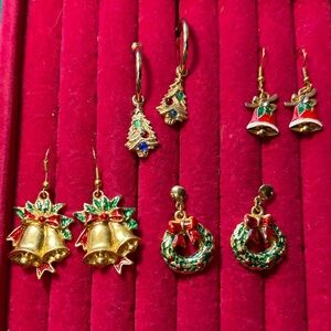 Celebrate the season with this charming set of holiday-themed earrings. Featuring gold and green designs, these earrings are perfect for adding a festive touch to any outfit. Sold together as a lot of four set of earrings.
