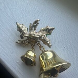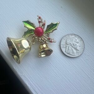 Charming vintage brooch featuring gold bells with red holly and green leaves accents. Perfect for holiday wear. Very slight wear