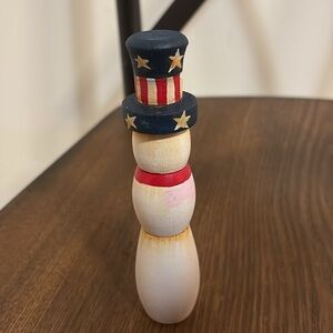 Add charm to your holiday decor with this delightful snowman figurine. Featuring a vibrant red scarf and a patriotic blue hat, it's perfect for bringing festive cheer to any space. Wooden spindle