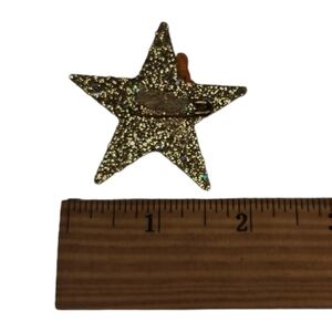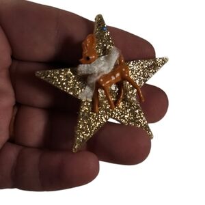 This pin is a cute, gold glittery star with a tiny little reindeer glued on the front. This is a crafted piece, but in good condition.