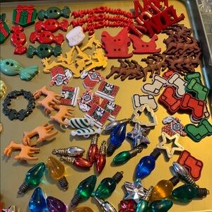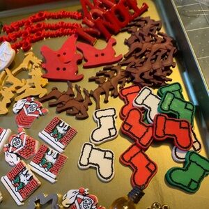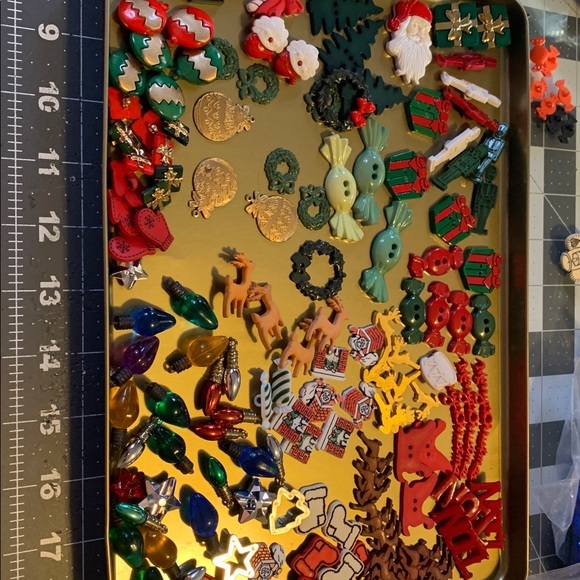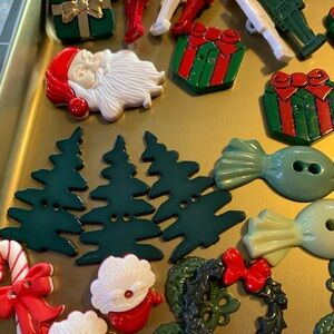 A vibrant collection of holiday-themed buttons. Includes designs like Christmas trees, candy, and stars. Perfect for crafts and decorations.