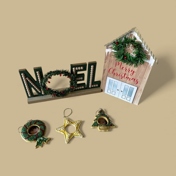 Enhance your holiday decor with this charming set featuring a 'Noel' sign and a 'Merry Christmas' house. The set includes 2 stands 3 picture Christmas tree ornaments, perfect for adding a festive touch to your home.
