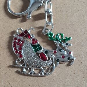 Set of three festive holiday keychains featuring candy cane, bells, and sleigh designs. Perfect for adding holiday cheer.