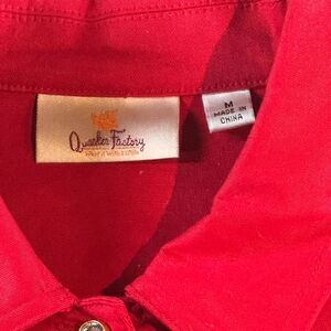 Super cute and flattering red stretch denim jean jacket with rhinestone buttons.