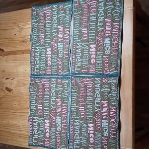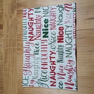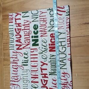 Set of holiday tapestry placemats with 'Naughty' and 'Nice' text in red and green.