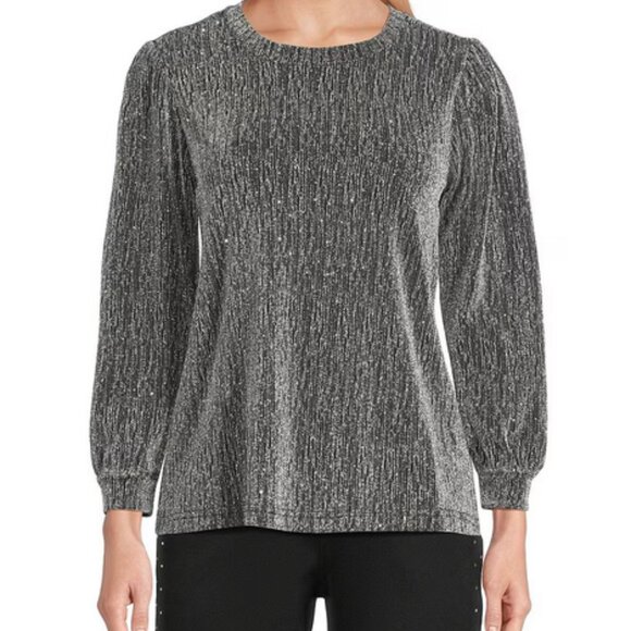 Textured knit top with vibrant multicolor fabric. Crewneck line, bracelet length poet sleeves, straight ham, pullover, polyester/metallic/spandex, machine wash/dry flat
