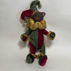 Charming jester bear plush with vibrant red and green colors. Features gold accents and a playful design.