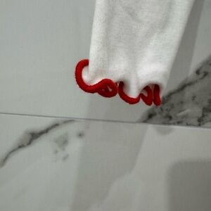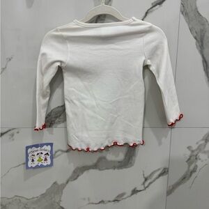 Christmas holiday kids long sleeve shirt featuring a playful reindeer design. The white fabric is accented with red and brown details, perfect for holiday fun.