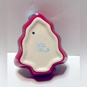 Pioneer Woman ornaments are colorful measuring set featuring a Christmas tree design, measuring cup, teacup and wreath . Includes red, white, and green elements with festive patterns.