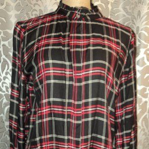 Red, Black and White are the colors used to create this light and shear plaid blouse. Full hidden button front, with small ruffle details at the top of the collar and at the bottom of each sleeve.