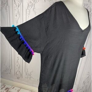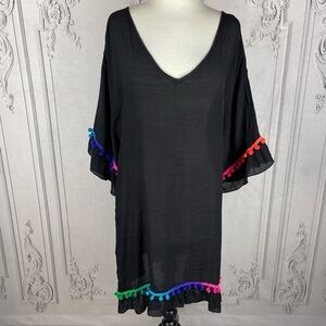 Festive Pom Pom Loose Fit Short Ruffle Sleeves V-Neck Dress Swimsuit Coverup