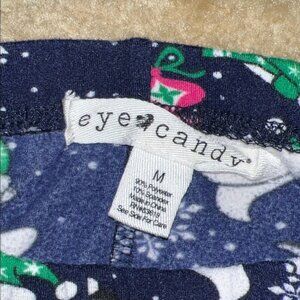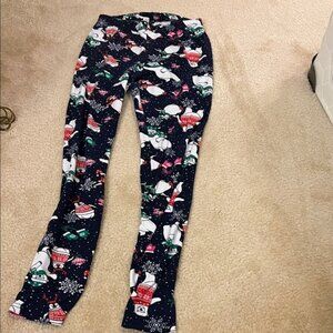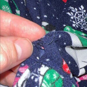 These festive bottoms feature a playful holiday print, perfect for adding cheer to any outfit. The vibrant colors and comfortable fit make them ideal for everyday wear. Very soft. Medium size but a little small in the thigh section. There’s one small wear spot in the crotch, but can be easily be fixed.