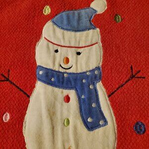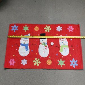 Festive Red Indoor Christmas Rug With Snowman Design And Colorful Snowflakes