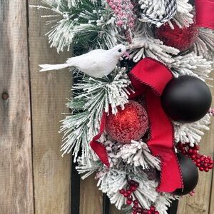 Add a touch of elegance to your holiday decor with this festive red and black swag. Perfect for creating a warm and inviting atmosphere.