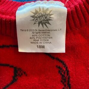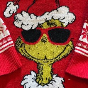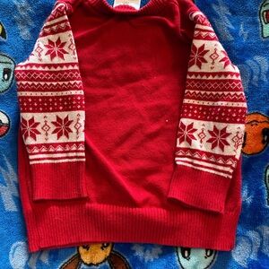 This cozy sweater showcases a vibrant red and green color palette, adorned with a festive winter-themed pattern. The round neckline is highlighted by a white trim, and the front features a playful circular graphic surrounded by a fluffy embellishment.