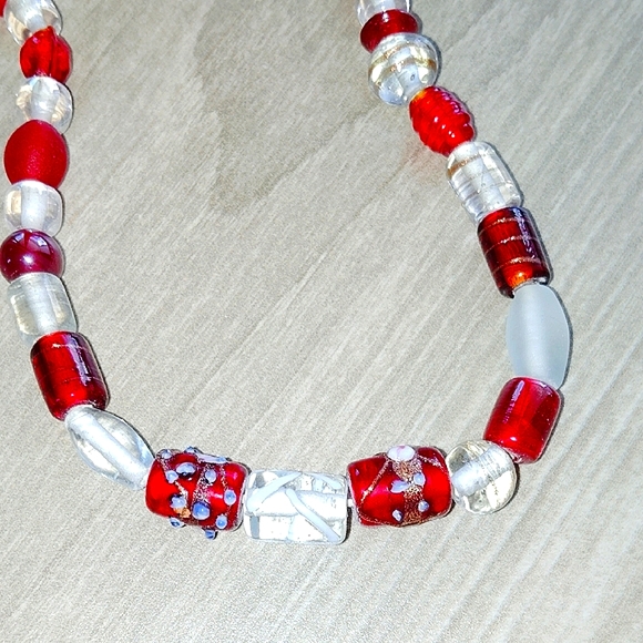 This striking necklace features a vibrant combination of red and white glass beads, creating a captivating two-tone design. The red beads boast a candy-cane hue, while the white beads offer a pearly, translucent finish. Intricate focal beads add a touch of elegance, making it an ideal accessory for holiday celebrations.