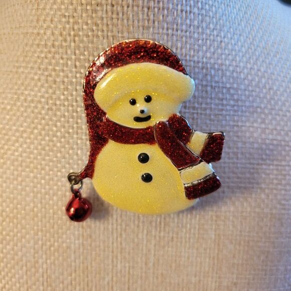 Add a touch of holiday cheer with this charming Snowman brooch. Featuring a delightful red and white glitter design, it's perfect for festive outfits.