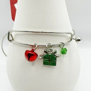 Stylish silver charm bracelets featuring vibrant green and red accents. Perfect for adding a festive touch to any outfit. Santa Clause, reindeer and gift charm bracelets