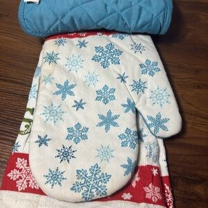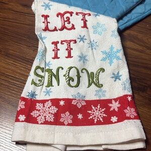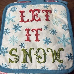 Brighten up your kitchen with this festive pot holder set featuring a cheerful 'Let It Snow' design. Perfect for adding a touch of holiday spirit.