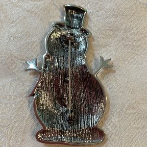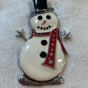 Add a touch of holiday cheer with this charming snowman brooch. Featuring vibrant red and classic black accents, it's perfect for any festive occasion.