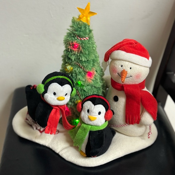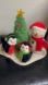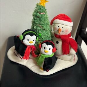 Charming Christmas decor featuring a snowman and penguins. Perfect for holiday displays.