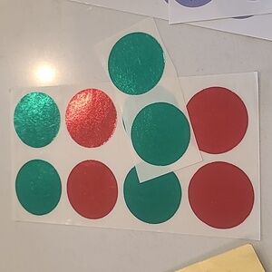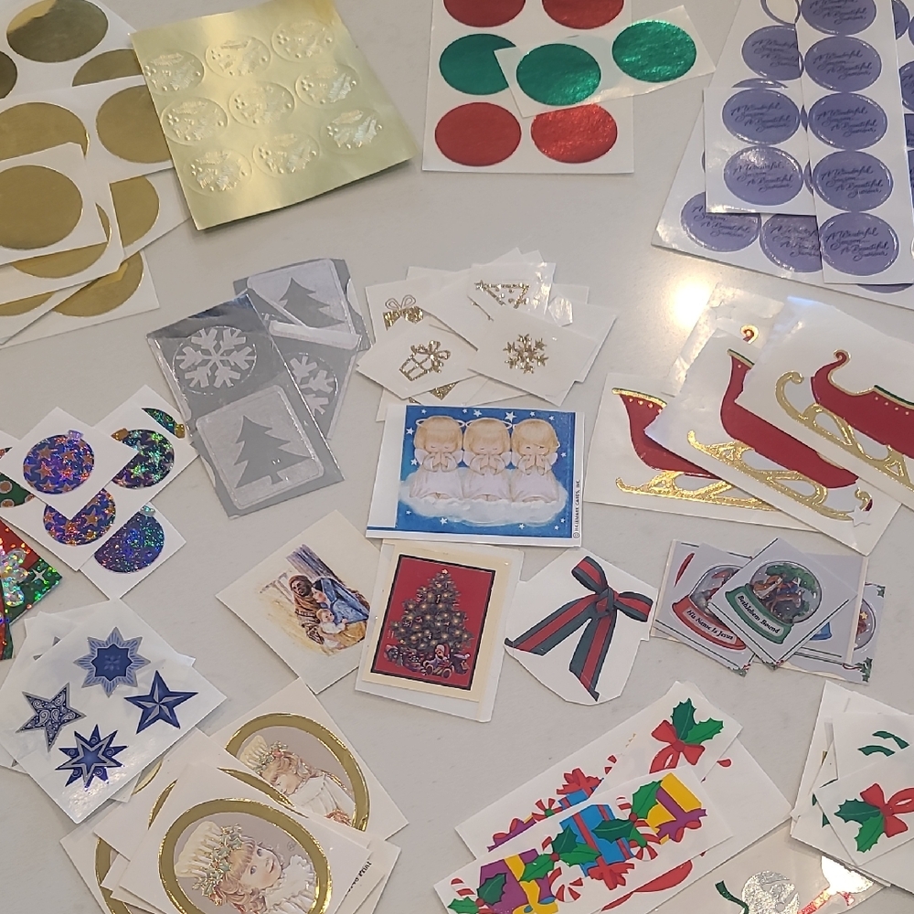 A vibrant collection of festive stickers. Includes gold, red, green, blue, and purple designs. Perfect for holiday crafts and decorations.