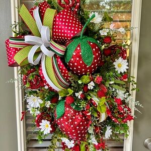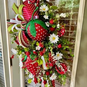 Brighten your home with this festive strawberry-themed holiday wreath. Featuring vibrant red and green colors, this wreath adds a cheerful touch to any door. Perfect for celebrating the season with style.