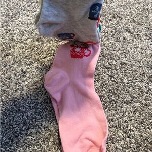 Colorful socks with a tree pattern. Features red and green trees on a white background.