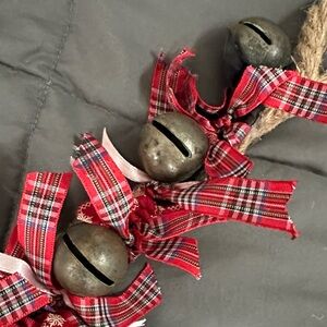 Add a touch of holiday cheer with this festive jingle bell door hanger. Featuring vintage turn-of-the-century sleigh bells and charming red plaid bows, it's perfect for welcoming guests with a joyful sound. Handmade. Measures approx 26” long. Nine brass sleigh bells.