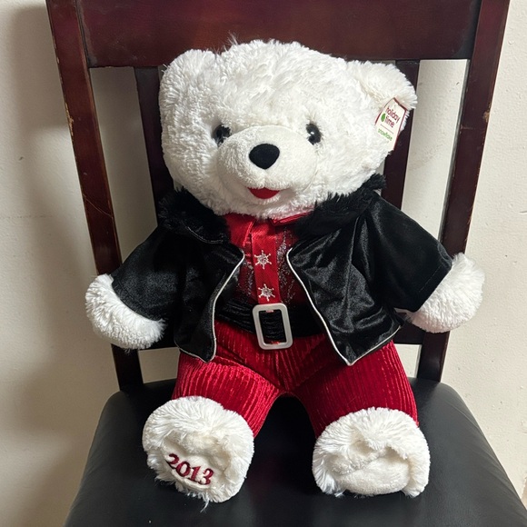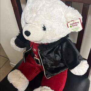 Festive White Teddy Bear in Black Jacket and Red Outfit 19 in