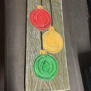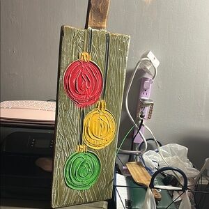 Festive Wooden Holiday Decor with Red, Yellow, and Green Ornaments
