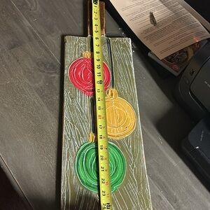 Brighten your home with this charming holiday decor featuring vibrant red, yellow, and green ornaments. Perfect for adding a festive touch to any room.