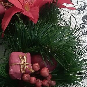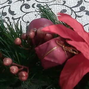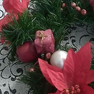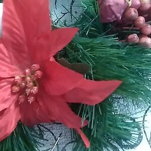 Brighten your home with this festive holiday candle ring featuring vibrant red poinsettias and lush green foliage. Perfect for adding a touch of holiday spirit to any room. The inner diameter is approximately 4 inches. Makes for a lovely table centerpiece.