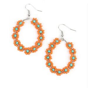 Dotted with mismatched multicolored beaded centers, a dainty collection of multicolored seed beaded floral frames are threaded along a wire hoop for a fabulous floral fashion. Earring attaches to a standard fishhook fitting.