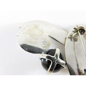 Vintage modernist design brooch pendant featuring abstract swirling silver forms surrounding two polished prong-set black onyx beads. Artist signed with conjoined TC and old eagle mark (partially unreadable). The pinback is not silver and shows minor surface rust.
