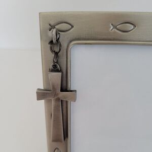 Featuring an eye-catching hanging cross along with the Christian fish symbol along the entire border, the frame will lovingly display your favorite horizontal photo of your loved one. Frame is in excellent condition.