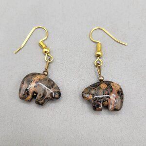Fetish Bear Shaped Leopard Jasper Stone Dangle Earrings Gold Tone Hooks