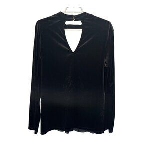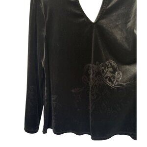Fever Black Velvet Long Sleeve V-Neck Top Keyhole Back Subtle Scroll Pattern L
