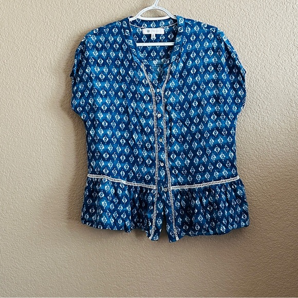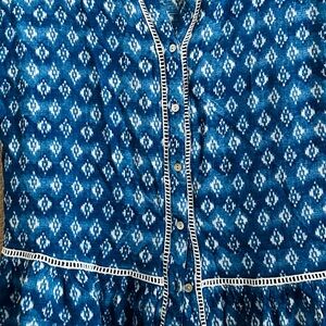 Style vneck, cap sleeves, peplum hem, geometric pattern. Fabric rayon. Color blue, white.