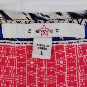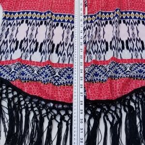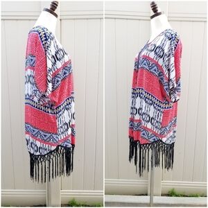 Fever Blue Red White Aztec Print Fringed Hem Kimono Open Cardigan, Large
