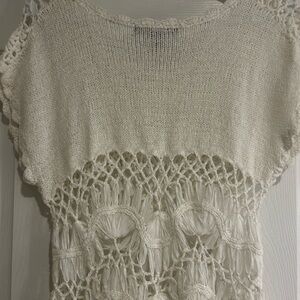Stylish ivory crochet knit top. Features delicate patterns. Ideal for layering.